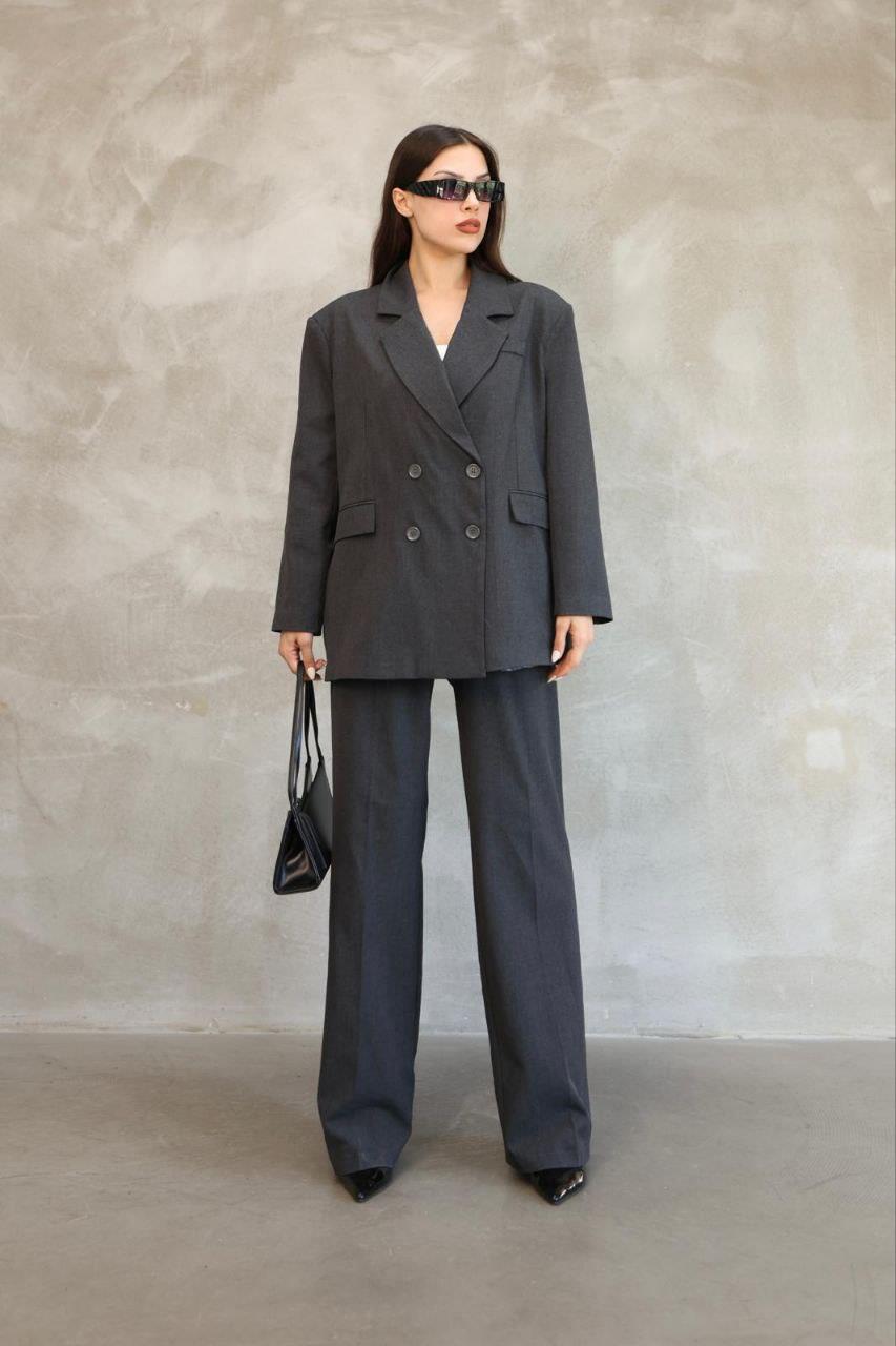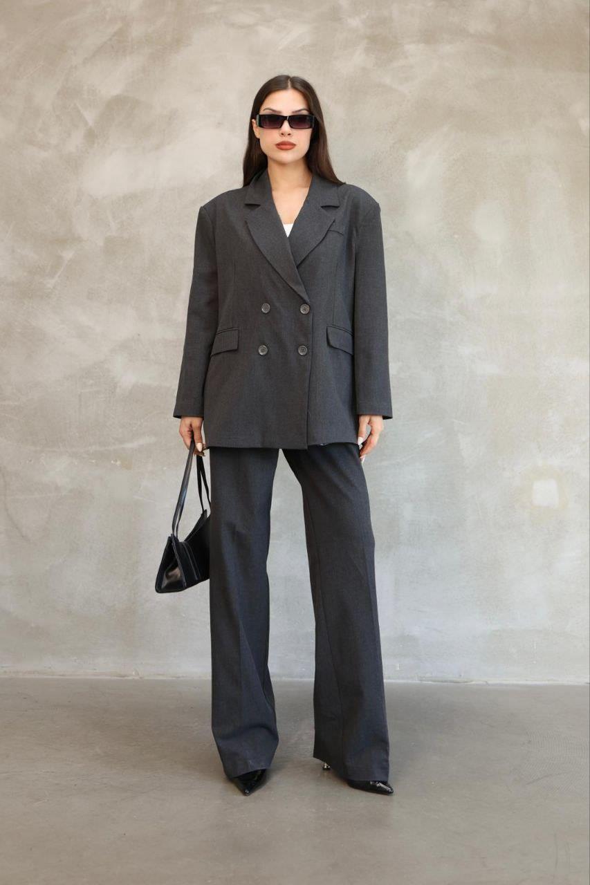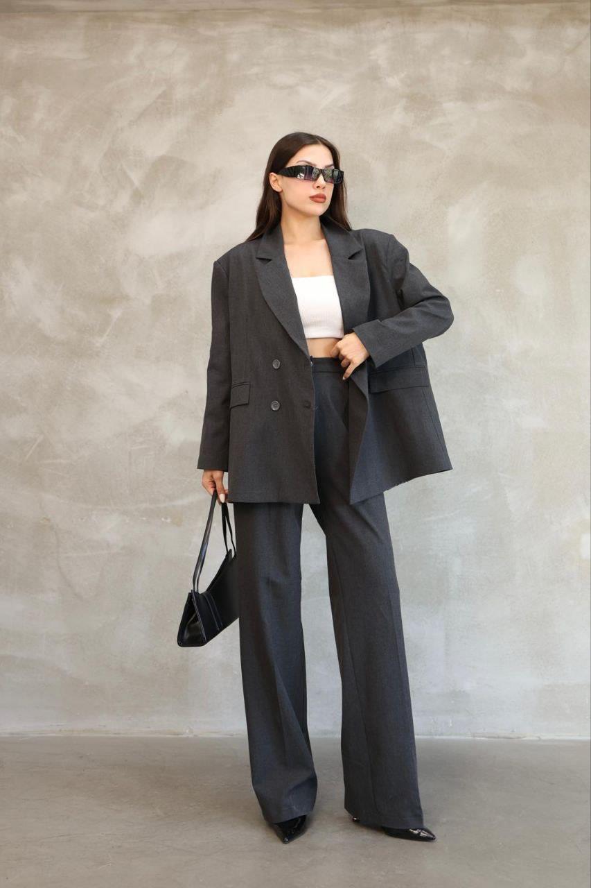 Kadın Antrasit Premium Oversize Blazer Ceket Palazzo Pantolon Takım