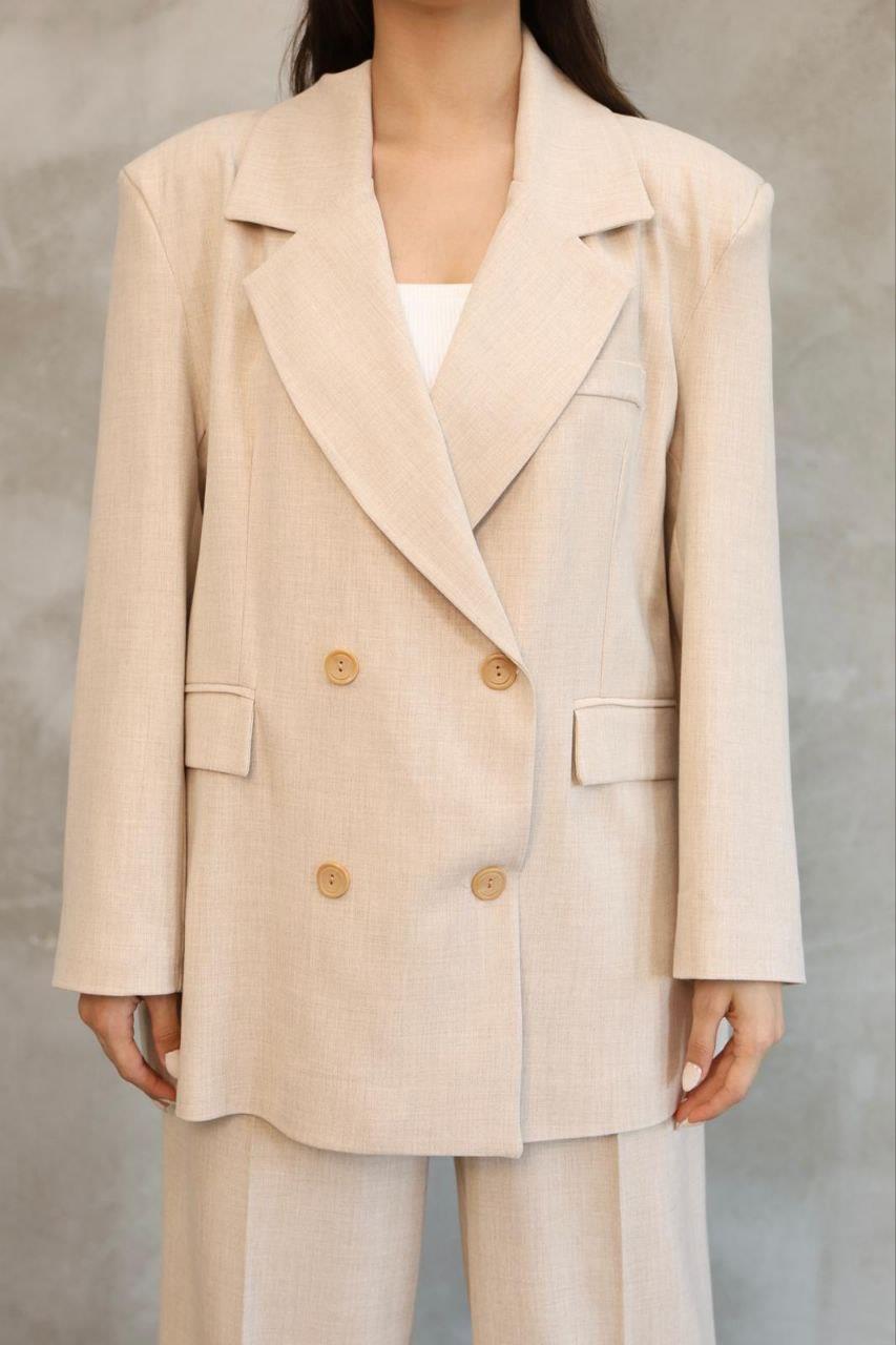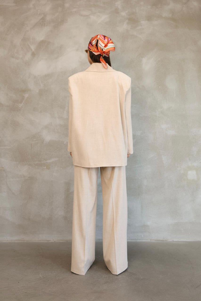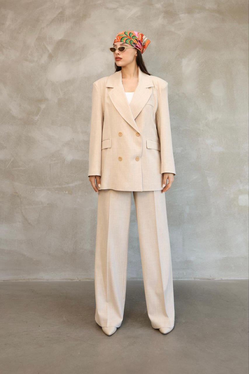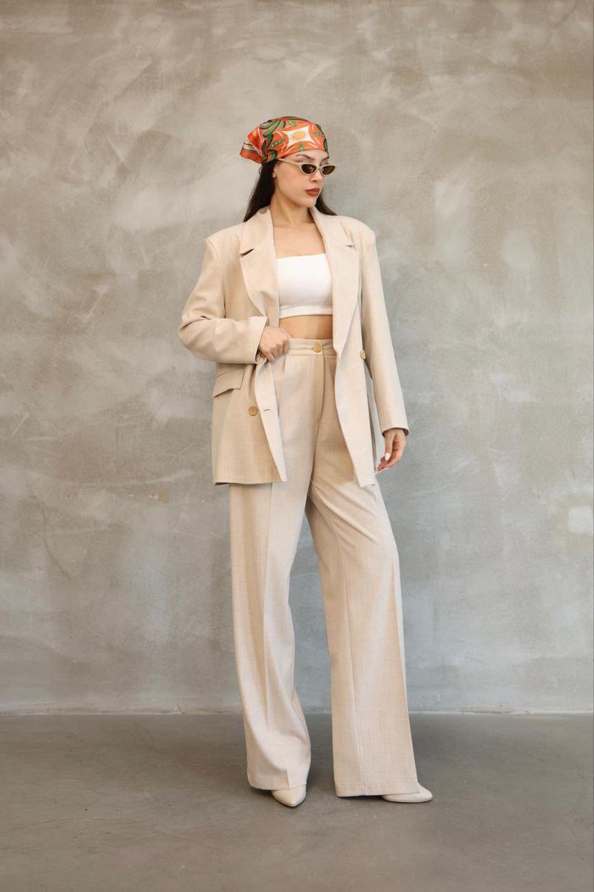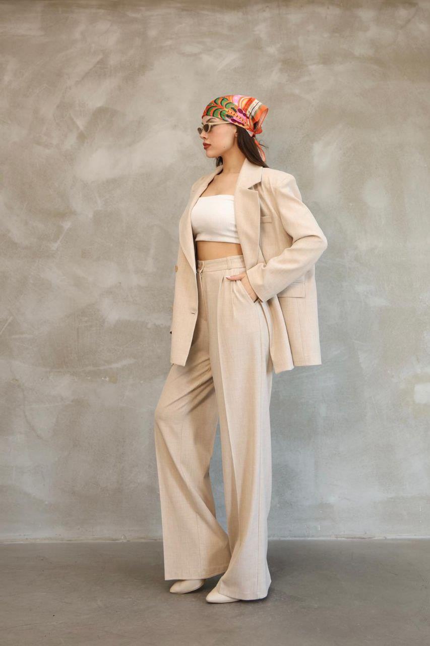 Kadın Bej Premium Oversize Blazer Ceket Palazzo Pantolon Takım