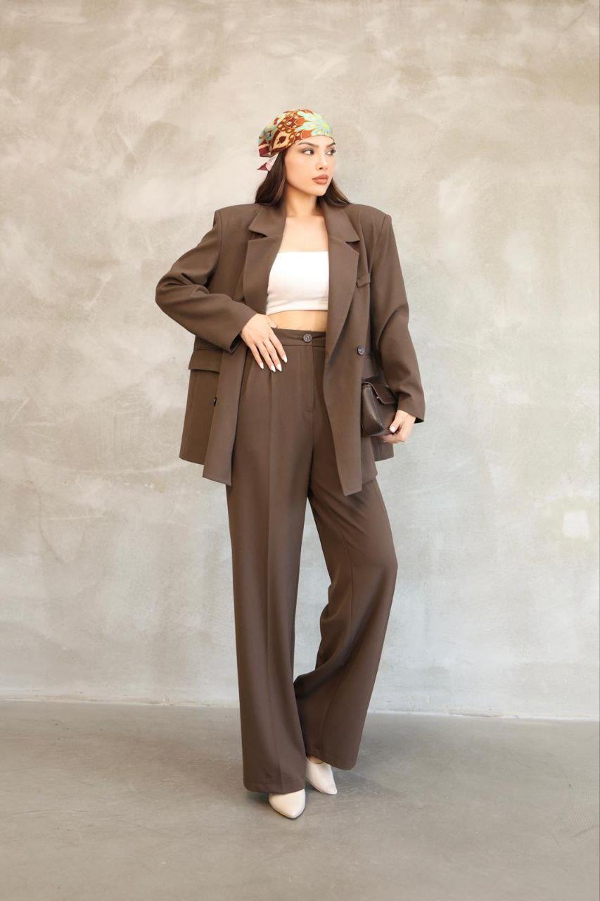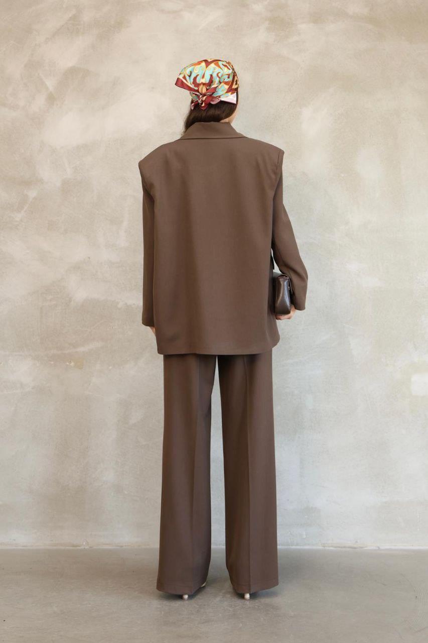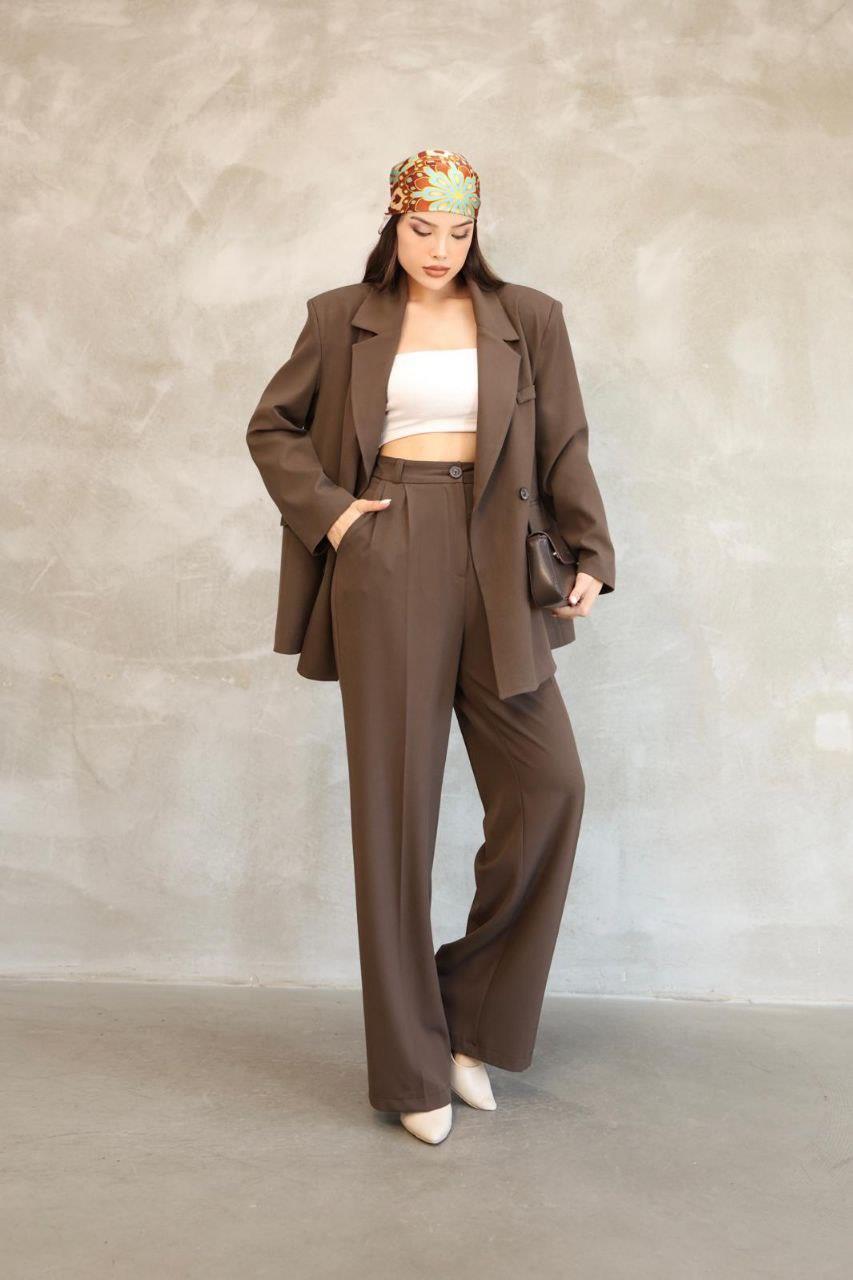 Kadın Kahverengi Premium Oversize Blazer Ceket Palazzo Pantolon Takım