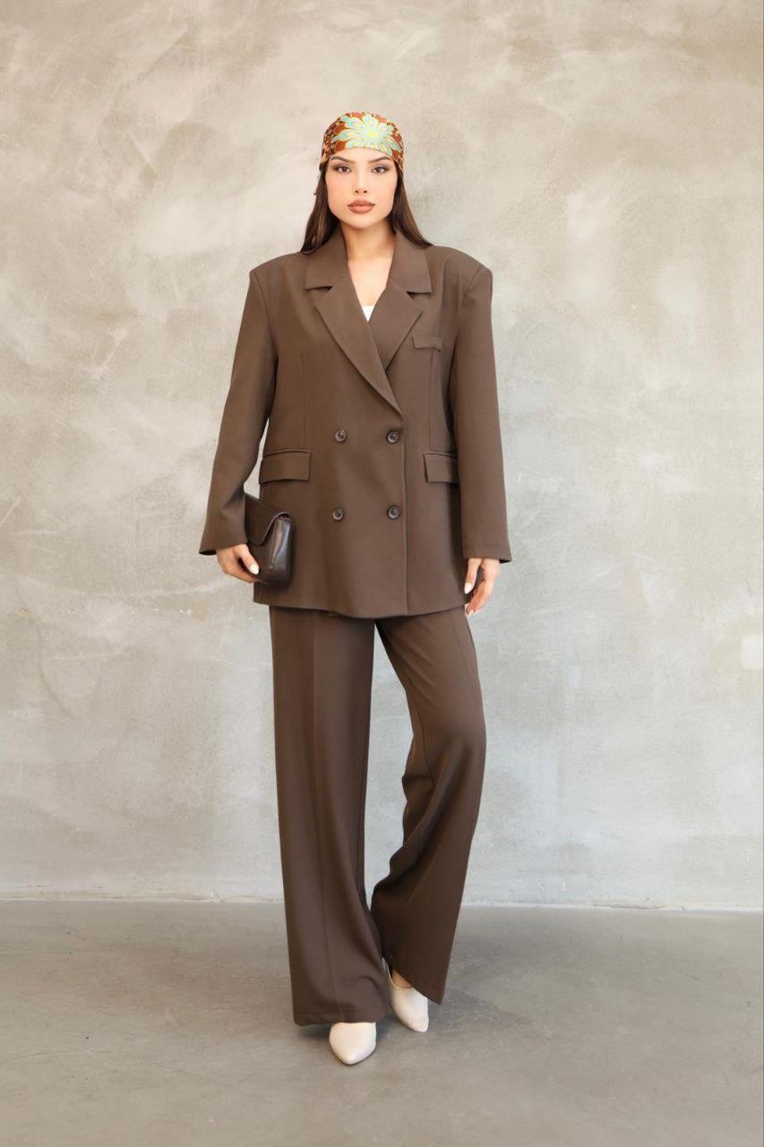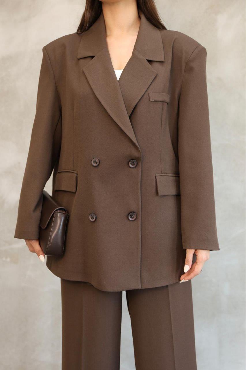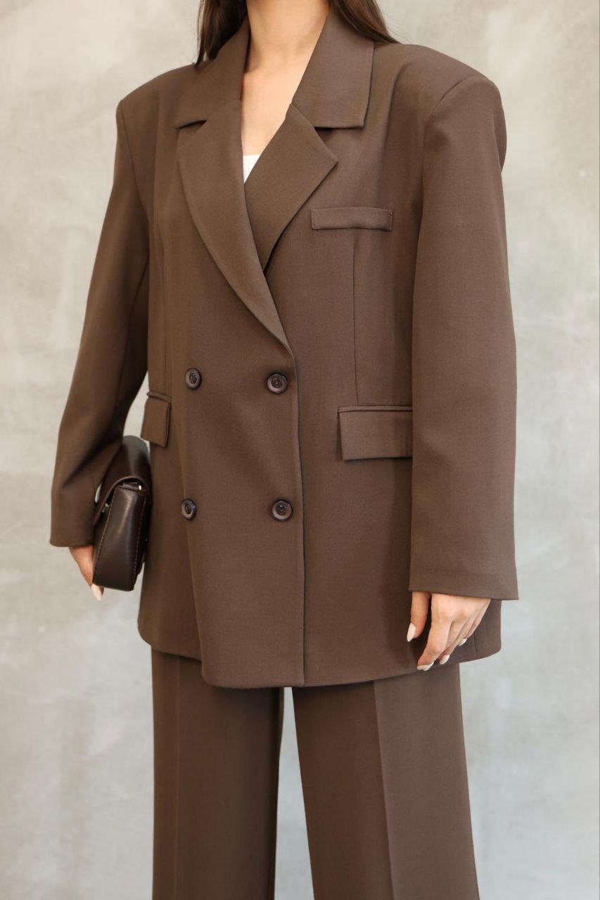 Kadın Kahverengi Premium Oversize Blazer Ceket Palazzo Pantolon Takım