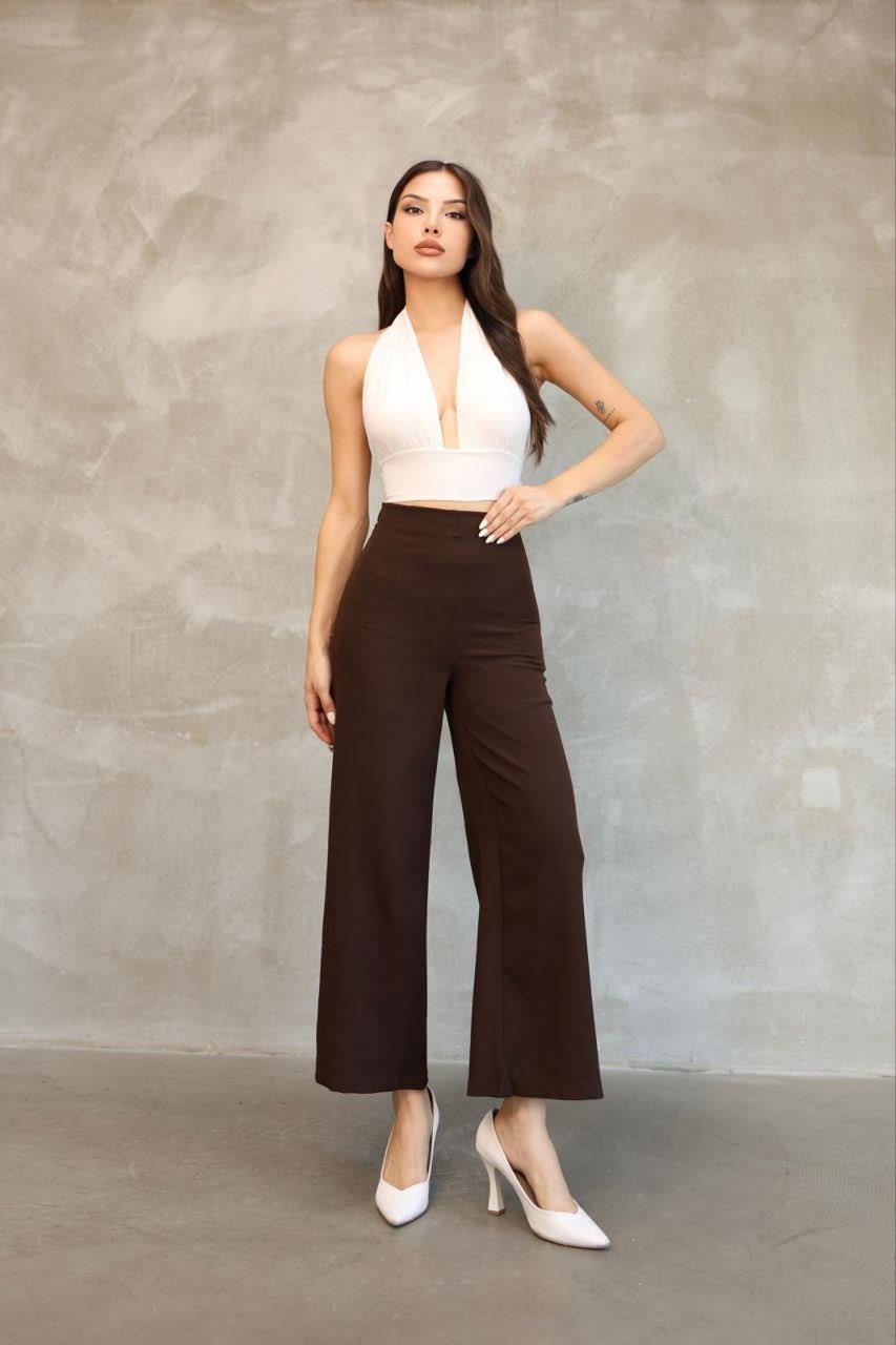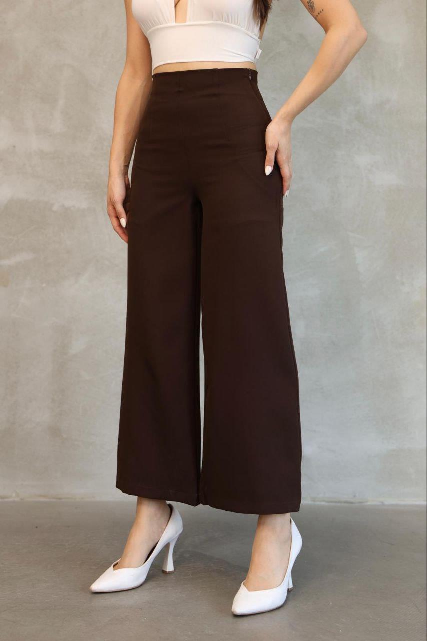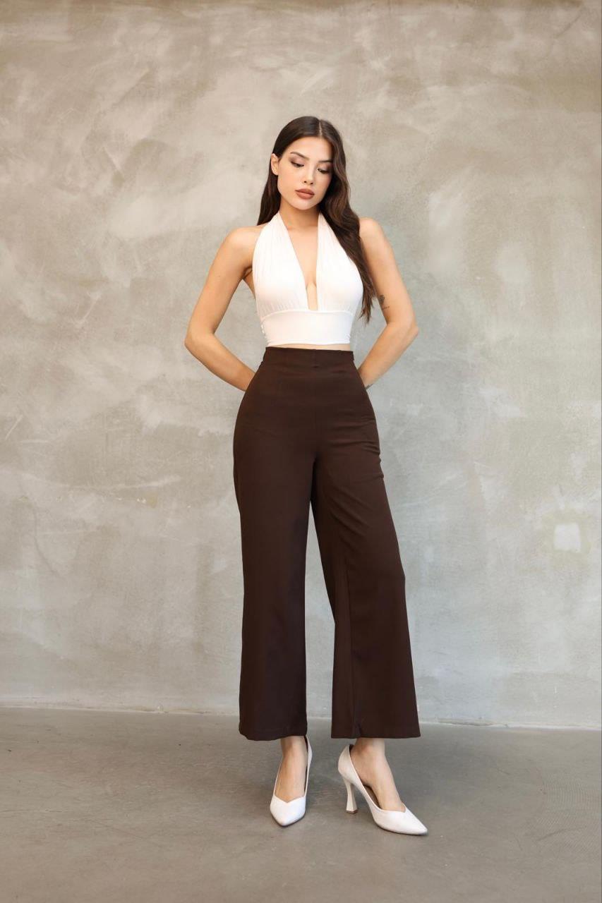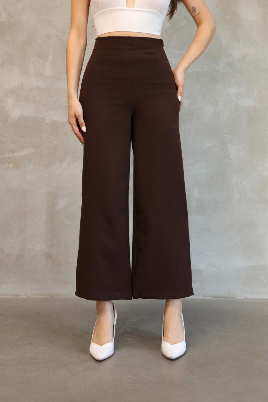 Kadın Kahverengi Premium Yüksek Bel Bol Paça Pantolon